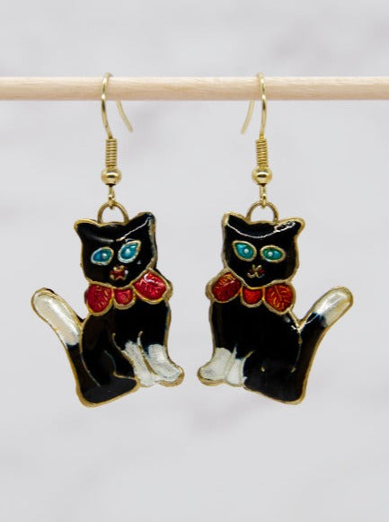 Indulge in the exclusive charm of Ebony the Cat Earrings. These hand-crafted earrings feature a curious cat adorned with a sophisticated red bow, made from premium quality copper and enamel. With a length of approximately 1 inch, these earrings are the perfect addition to any fashionable outfit.