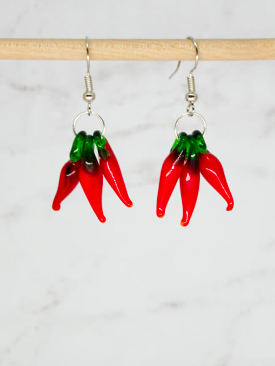 Indulge in a touch of Southwestern flair with our Mini-Chiles Earrings. Crafted with a trio of delicate glass chile peppers, these earrings add a playful yet sophisticated touch to any outfit. Measuring at 3/4", they are the perfect size to make a statement without overwhelming your look. Elevate your style with these elegant and exclusive earrings.