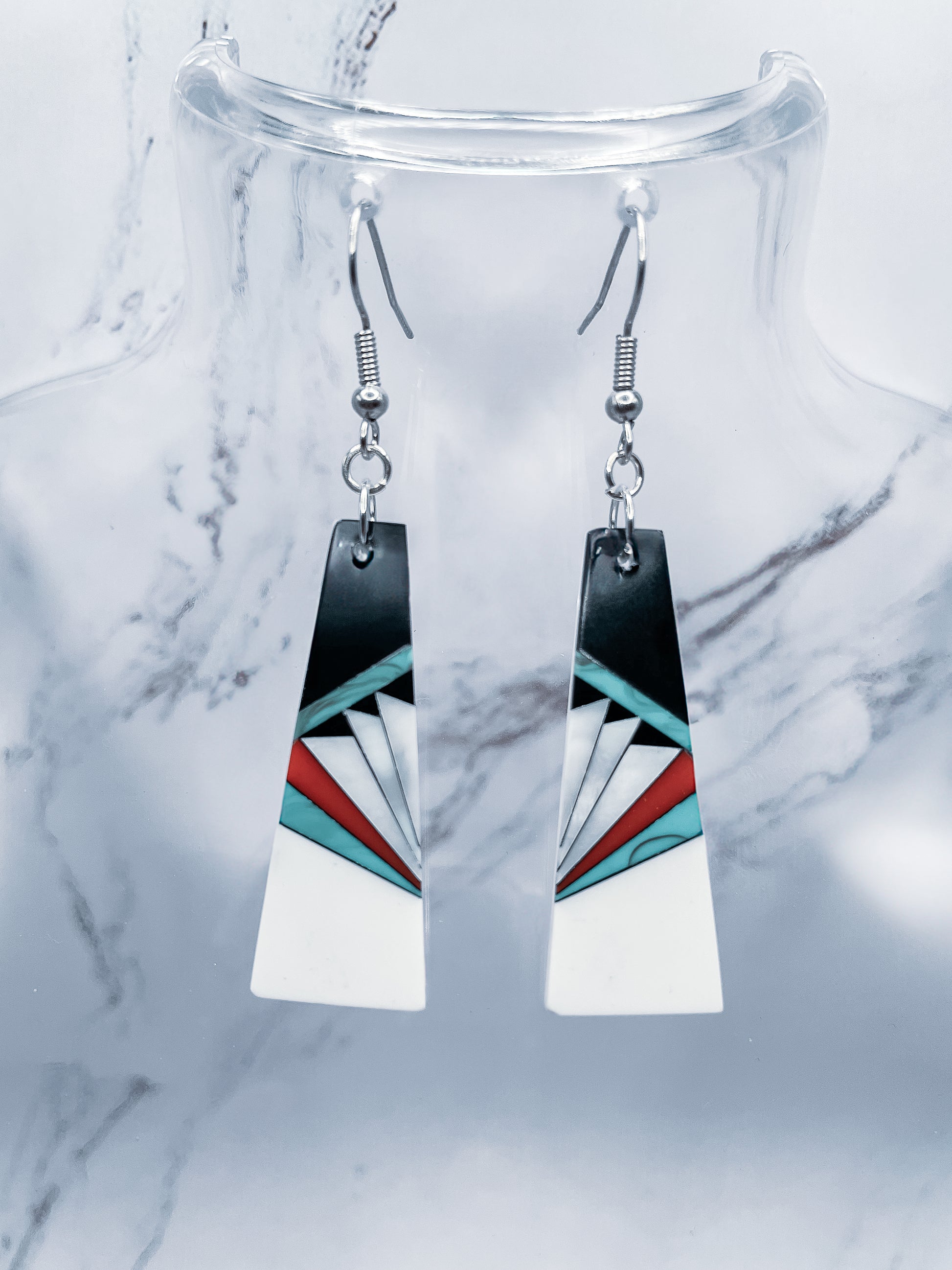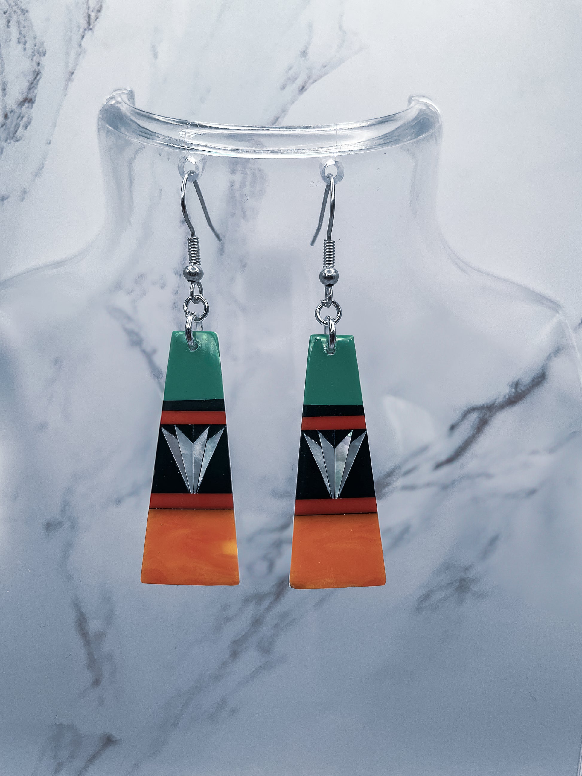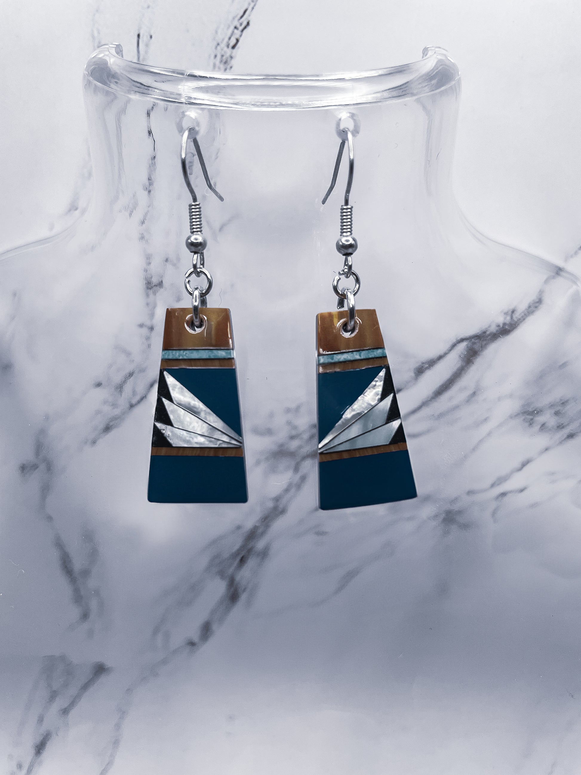 Discover the Native American influence with our exquisite inlaid designs featuring Mother of Pearl, Paua Shell, Black Lip Shell, Multi Shell, and Silver Finished Copper. Adorned with Resin Trapezoid and Oval Designs, these earrings exude luxury and exclusivity.