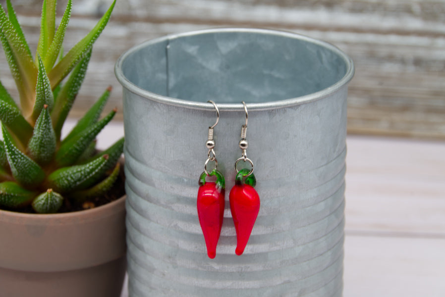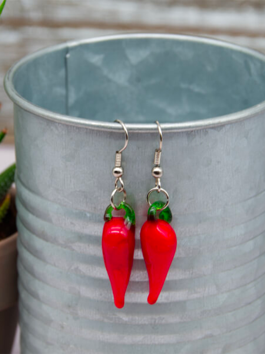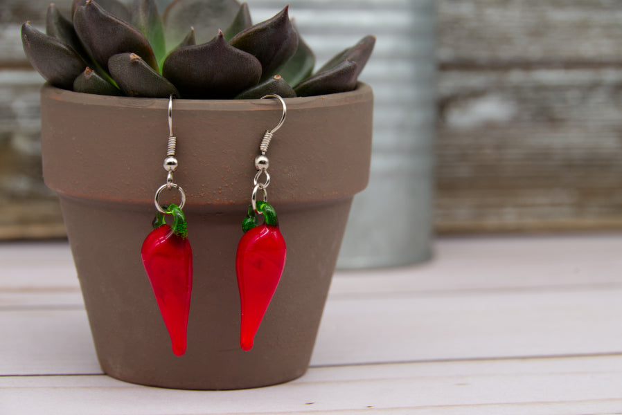 Lampworked glass chile peppers symbolizing the Southwest. Earrings are approximately 1" in length.