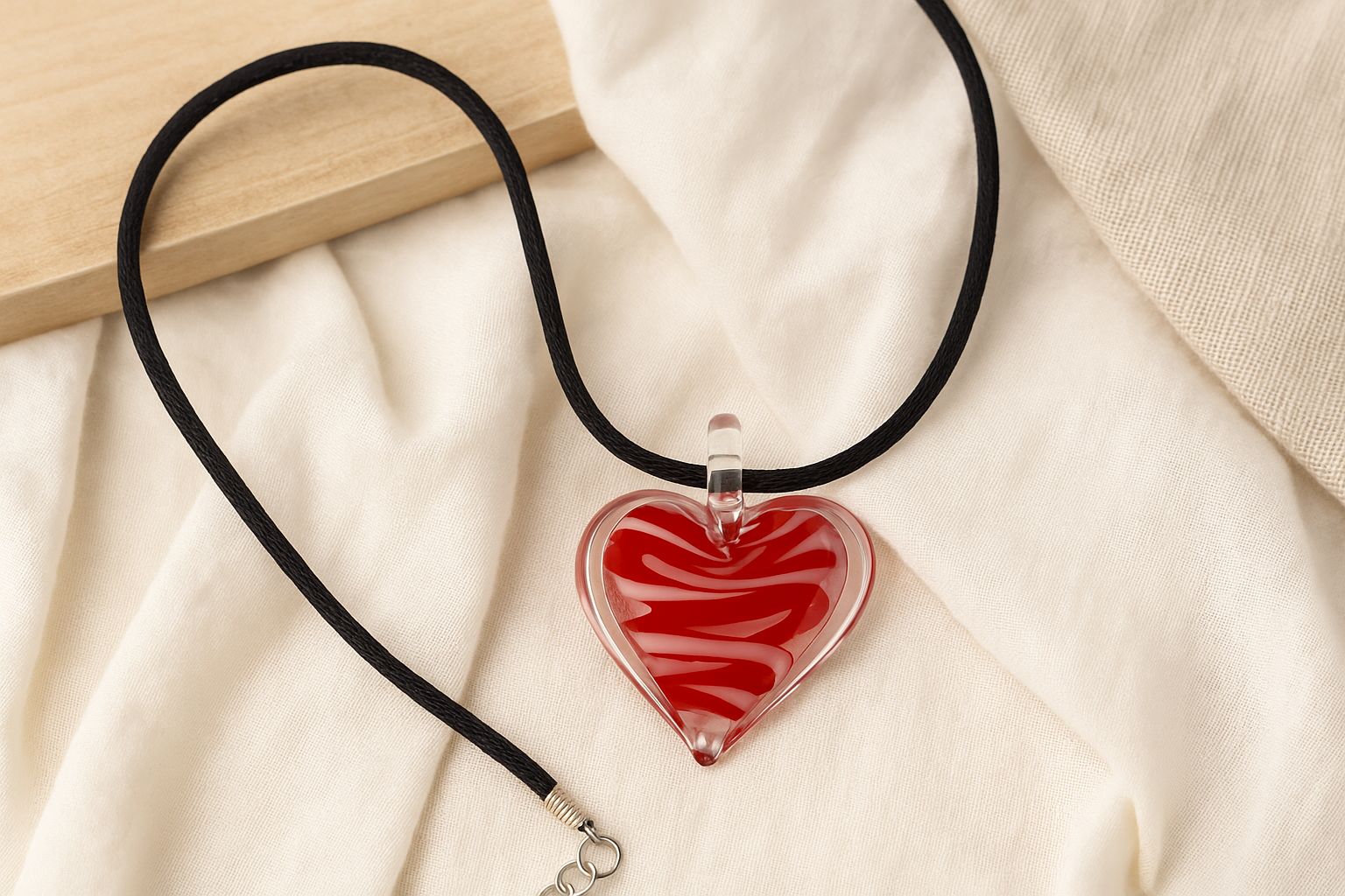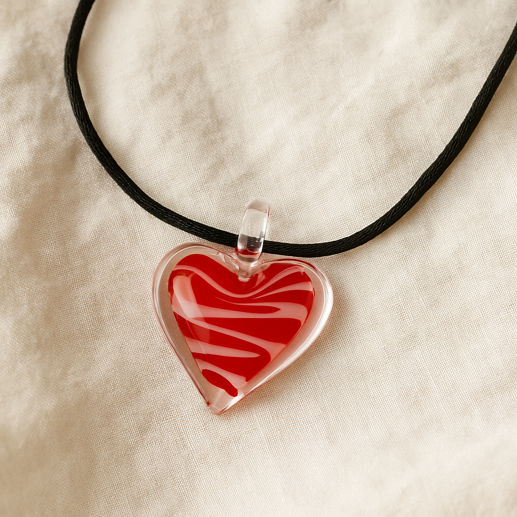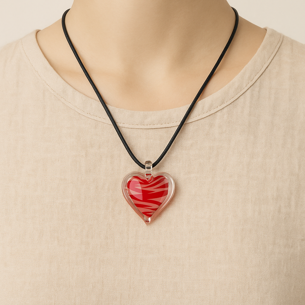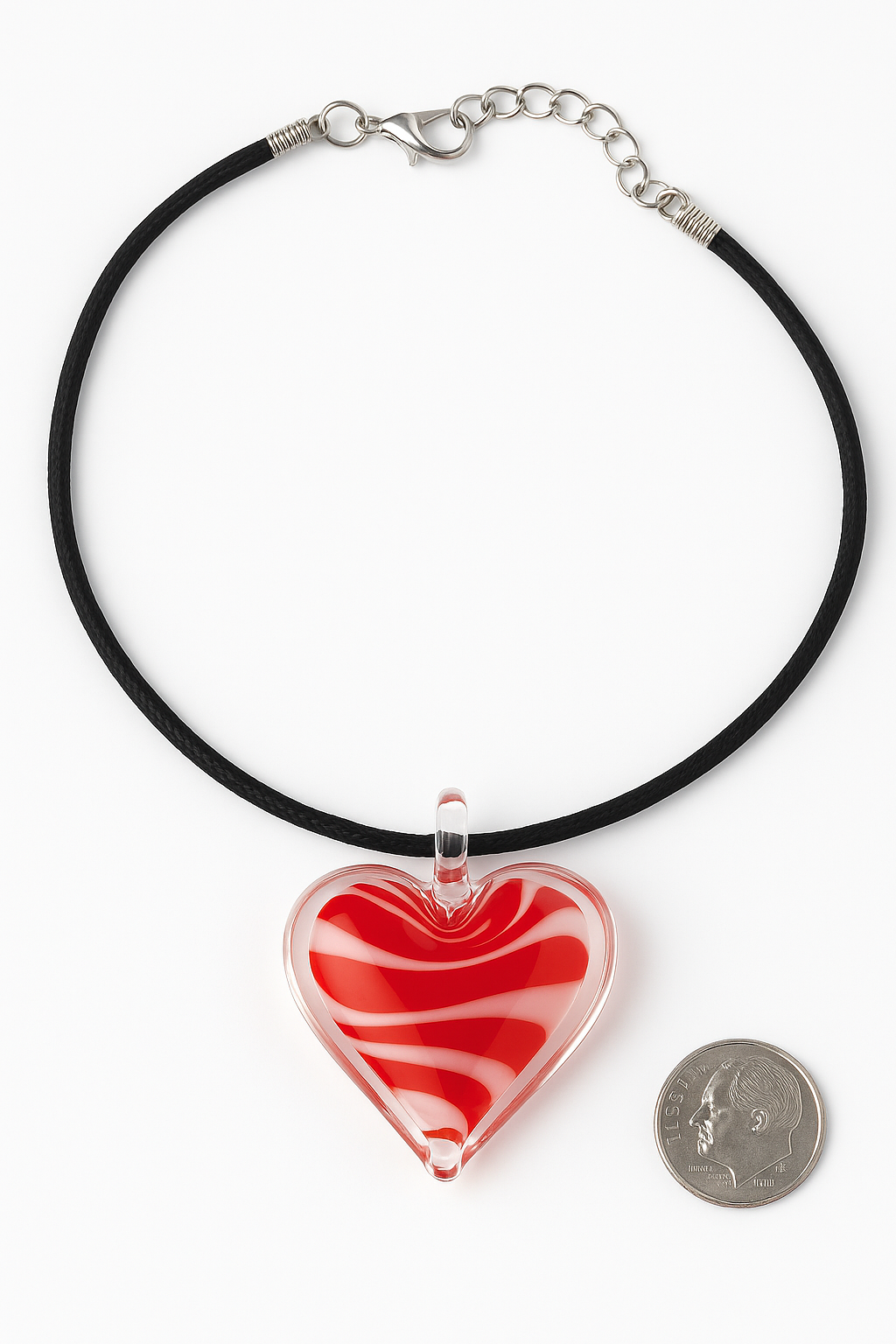 Indulge in the opulent beauty of the 2-inch Ribbons of Red Heart necklace, handcrafted with exquisite lampworked glass. Elevate your style with this luxurious piece that exudes sophistication and exclusivity.
