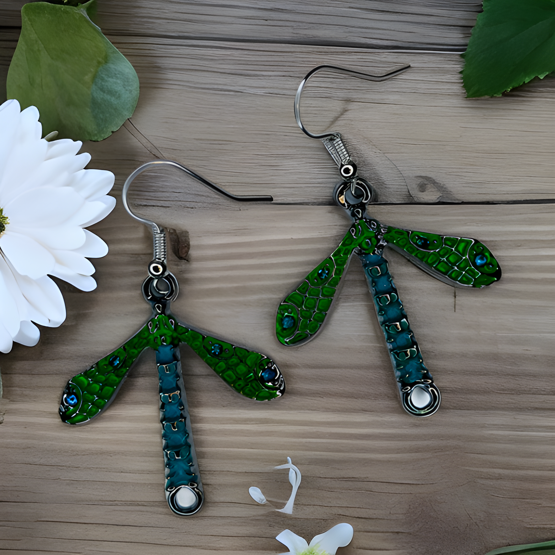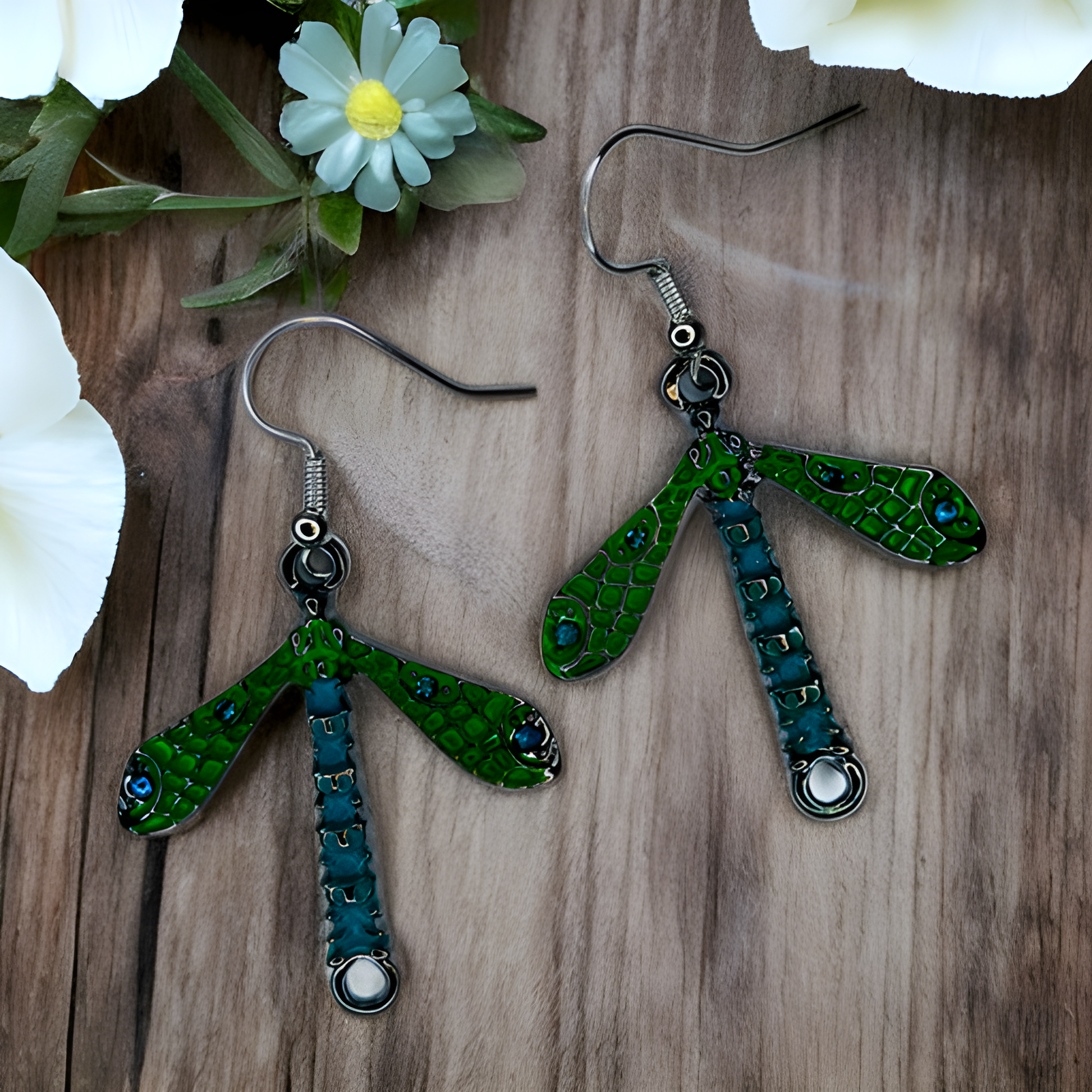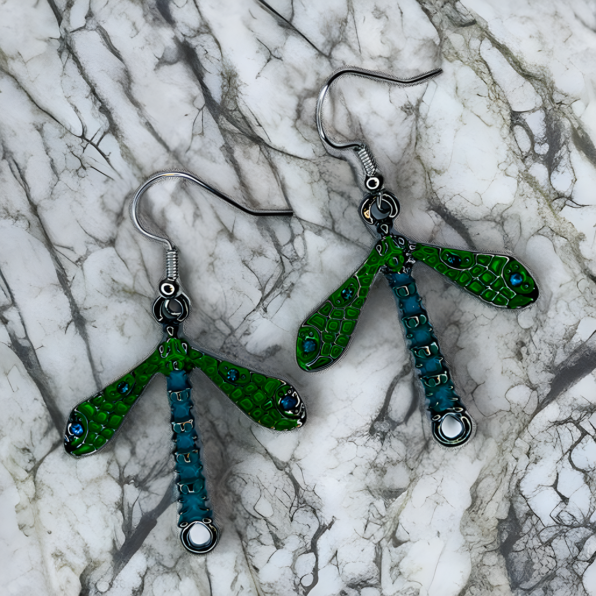 Artfully crafted and adorned with green rhinestones flecked with hints of turquoise, these exquisite Silvertone Spangled Dragon Fly earrings are a luxurious addition to your collection. These earrings measure 1 ½ inches, making them a perfect statement piece for any occasion.