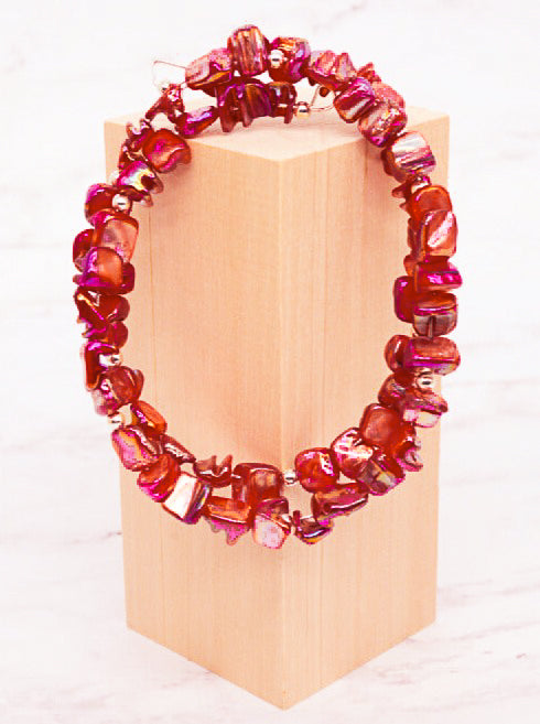 Magnificent memory wire bracelets of mini to small nuggets of Mother of Pearl to grace your wrist as a single or part of a stack of Mother Nature’s bounty. Colors are Gold, Heather, Terra Cotta and Forest Green. Fits just about every wrist.